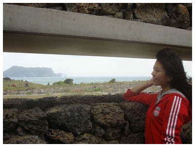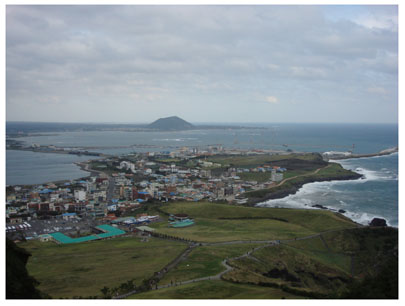 游玩方式强烈推荐和我们一样选择自行车!走走停停既浪漫又自由。(我们的自行车是和房东大叔借的,借不到的话岛上也有专门租车的地方,在牛岛网站上都有相关信息。)傍晚落日时分,一前一后踩着脚踏车,徜徉在牛岛的乡间小道,雪白的珊瑚沙滩、橙色的海岸落日仿佛从耳畔划过,让我回忆起和O-Ba一起度过的久违的校园生活……随着坡度时急时缓的乡间小道,有种分不清时空的错觉——有点像《龙猫》里面小月和小梅在田野间赤脚奔跑,也有点想,像《非诚勿扰》乌桑那样流着眼泪唱首心底的歌,然后在斜阳下一直拥抱他直到时间的尽头…… 在那里我们发现,自行车都没有车锁,骑到哪里就随手一放,不用担心被偷窃,家里的大门也不上锁,古老的夜不闭户的传说在那里却是事实呢。 P.S. 往返牛岛和城山港的船票共计5500W/人,买去程船票时,工作人员会给你一张牛岛宣传单,上面有往返渡轮的时间表。 Tips:城山港的售票处在那座白色的房子里面,牛岛的话则一定要在下船时记清码头的位置哦! 第二天是东线的“济州风土”一日游。城山、涉地可支、山君不离都是去济州一定要去的地方,这些景点与我们中国的名山大川比起来,绝对算不上雄奇,但绝对各具特色,值得一看。 城山日出峰 我们爬城山的时候,狂风大作,有种头皮要被掀翻的感觉……但从登山伊始到登上山顶不断回头观望,那片海湾的风光还是很美很别致的。我没留意看城山的海拔,但我确信一个成年人30分钟登顶绝对不在话下,因此天气好的话,可以多留点时间在山顶驻足,蓝天白云下的绿草坡一定更醉人吧。 P.S. 我想城山那一带真的是个极爱刮风下雨的地方,我看到的游记超过一半都说在登城山时遭遇了坏天气,所以要去的人都要做好心理准备。好在狂风大作时的城山,也有着独特的阳刚之美,海浪拍着石壁发出的轰鸣,风中摇摆着较弱身躯的野花,海风吹痛面颊的难忘回忆,想起来也是种难得的美好。  (风好大,这是城山半山腰的俯瞰~很美吧!)