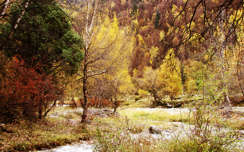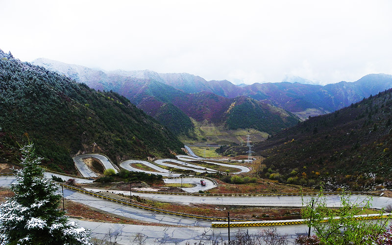 翻过达坂山,雪层越来越薄,连山的雪景变得稀稀拉拉,这大概就是神奇的雪线营造出的自然美景。直到我们来到十二盘,雪已经融得差不多,道路开始显现出本身的柏油色,十二盘的发卡弯在红绿相间的山腰上扭动盘旋,动感十足。这里也有一个供游客观赏拍照的平台,可以摄下十二盘全景。 之后的景色已经无法用文字去记录了,一定要身临其境地感受,整个互助北山就是一个特大型的天然公园,光是在山间盘绕就能饱览所有想象不到的秋日美景。有别于之前看到的马蹄寺风景区和湟源大峡谷,小溪在山脚穿行,时宽时窄,清澈活泼,使是整片景区充满动感。