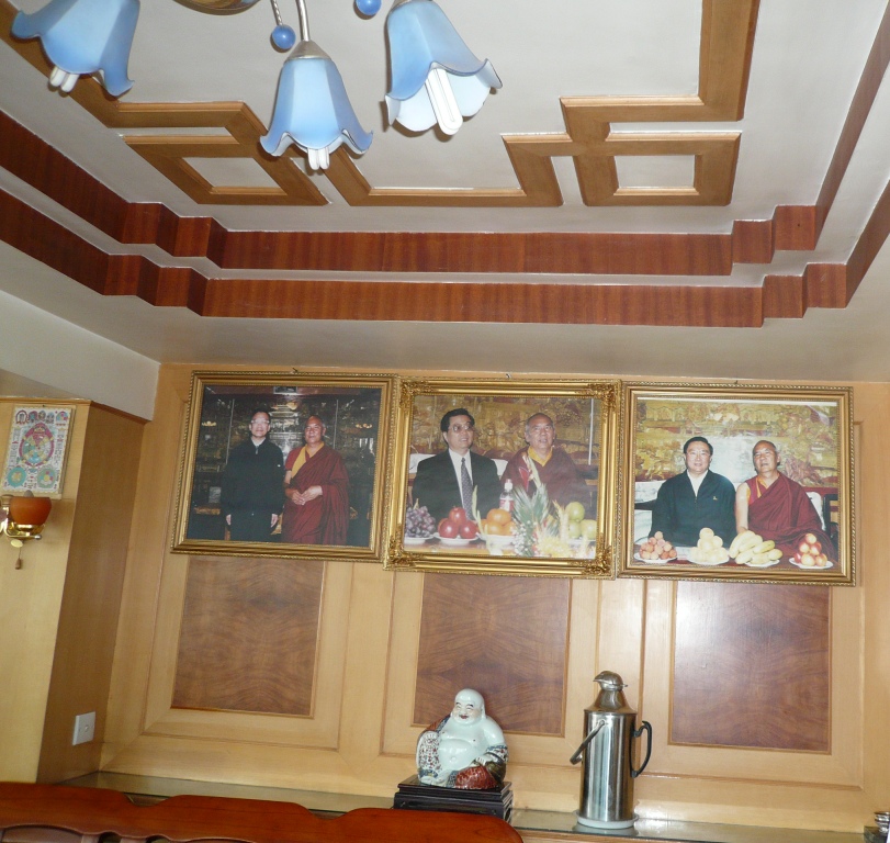 再次双手合十拜谢活佛后准备告辞,抬头看见墙上挂着活佛与胡锦涛、温家宝、罗干的合影,于是拍下纪念。出来后,X告诉我们,哈达带回去后,找个高处挂起,这是受活佛祝福过的哈达。不妨将与活佛的合影放大,然后把哈达挂在其上。不过家里实在是找不到地方挂这个,迄今这两条哈达还收藏在我的衣橱抽屉里,这是后话了。
