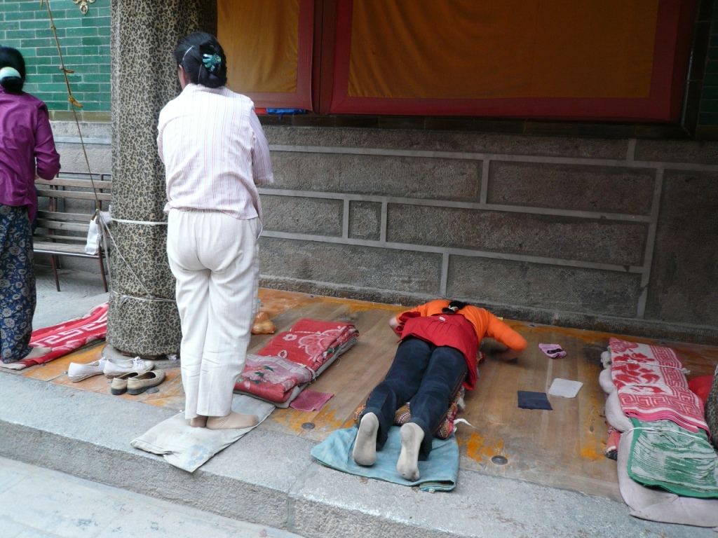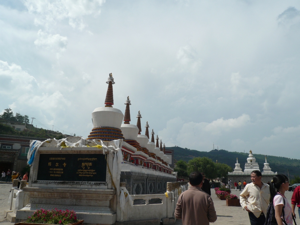 坐车下到塔尔寺的入口处,门口是8座白塔,据说是为了纪念佛祖释迦牟尼的八大功德而建。这里是塔尔寺的标志,所有来游览的人都会在此留影。今年因为年初藏独闹事的影响,来青海旅游的人大幅度减少,不过眼前所见,还是相当多的游人的。远远望见一女子在磕着等身长头,站立、双手合十、双膝跪地、全身匍匐在地朝拜、再起身站立,如此循环往复着,极之虔诚。导游告诉我们,在寺中的大殿,似这般跪长头的人比比皆是,大多是许的愿望实现了,来还愿的,要磕上10万个等身长头。年纪大的要磕上一年,便是我们这般青壮年,也至少要磕上3、4个月,每天寺庙开门,他们便来到开始磕头,寺庙关门,他们才离去。听着介绍,对这些人如此的虔诚实在是佩服不已,但同时也告诫自己,愿望不可轻许,否则还愿可是麻烦事。后来在寺中确是见到很多磕长头的人,以妇女居多,看来女子更容易将自己的命运寄托在对佛道的信仰之中。