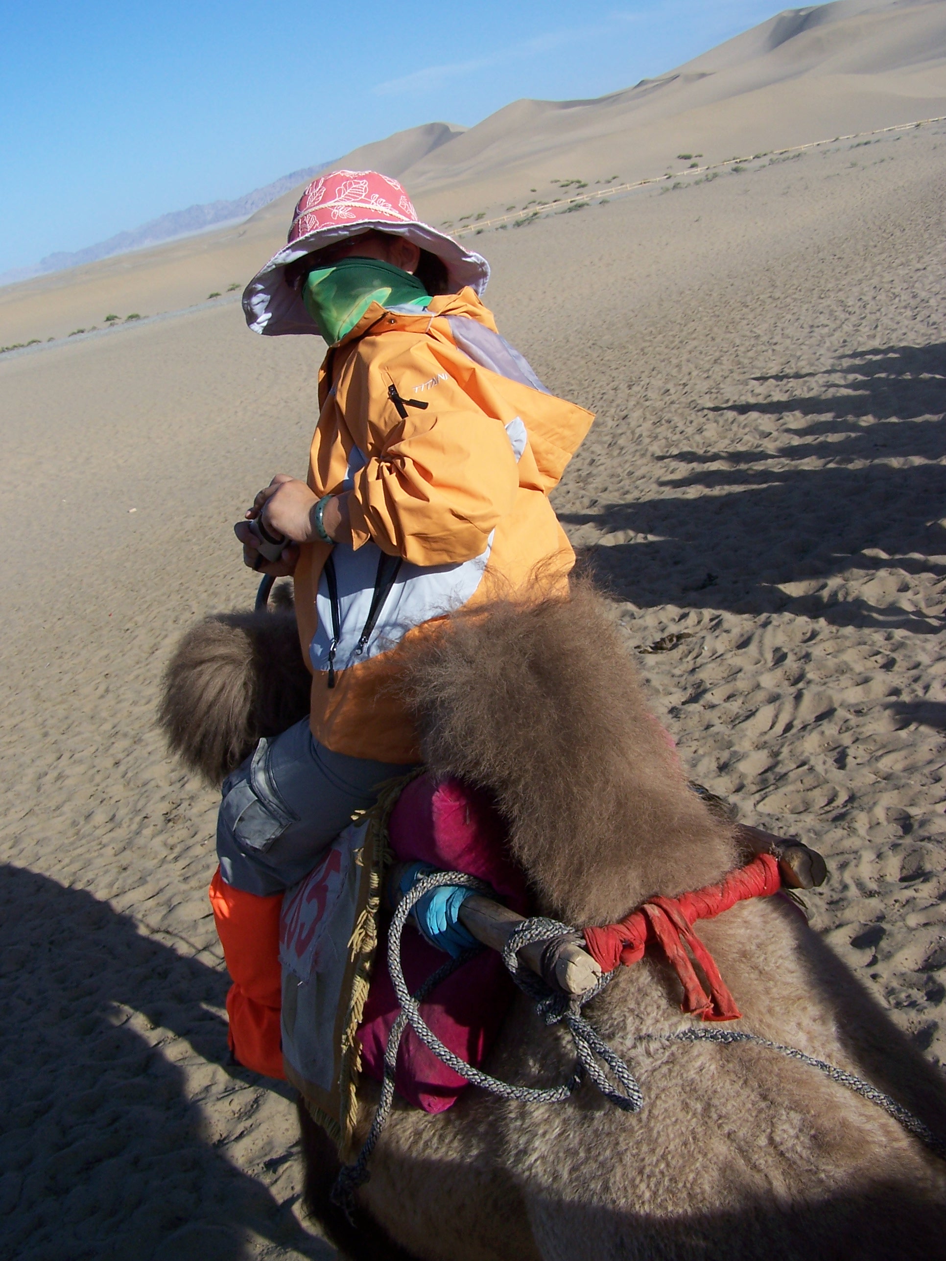 DAY2:敦煌――莫高窟、鸣沙山、月牙泉 敦煌,给我的感觉是一个动词,那个穿着飘逸纱丽反弹琵琶的飞天造型,她只存在于天方夜谭般的神话中。莫高窟更是神仙聚集的地方。当我们穿过戈壁,站在莫高窟那悠长的栈道上,那一扇扇紧闭着的门依然保持着矜持,等待着人们来开启。 莫高窟创建于前秦建元二年,止于元朝,现有洞窟492个,目前对外开放的也就30个不到。一般情况下会将参观者分成10多个人一组,由讲解员带领参观。因为怕破坏壁画的色彩,窟内严禁拍照。 也许是 印象最深的当然就数9层楼弥勒。她位于莫高窟的中端,是武则天在位时修建的,女皇自称是弥勒化身,整个佛像高达 感觉最新奇的是在某号洞窟的壁画上竟然看到了星座的图形,这应该不是后人添加的,星座早就通过西域传入我国了。 莫高窟凝结了数代人的智慧、经历的千百年的风风雨雨,但国人对她的了解真是少之甚少,她仅仅是一个景点而已。当我们回来后,看到新闻,就在 离开莫高窟这个艺术宝库,该去领略一下横卧于敦煌城南的鸣沙山了。西北的阳光很强烈,太阳要到8点左右才下山,我们下午5点才到那里,从敦煌市中心到鸣沙山大约就10来分钟。这里真是热闹,进入大门,被要求套上刺目的橘色鞋套,踏上沙地,就看到一旁卧地休息的骆驼,当然骑骆驼也是计划要玩的项目之一,有80元和30元两个档次,80元的几乎是走全程的,30元的记不得了,我们15个人也就行动一致的挑选80元的了。 骆驼被4个一组的栓在一起,由一名驼夫(不知该怎么称呼)带领,当然我们也是4个一组的被编号,按编号乘坐自己的坐骑,管理还是蛮到位的。这些人工驯养的骆驼很温顺,抱着它的大脑袋拍照也无所谓,骑在上面感觉比马背稳妥多了,后来基本可以双脱手的举相机拍照了。 驼队4个一组排队蜿蜒百米前行,坐在驼背上能看到远处起伏的沙山,据说这里的沙子是五彩的,可惜忘了去考证一下,中途有人拍照,技术还相当不错的,你满意就掏钱买,我们被带到一处滑沙场,要滑沙必须要爬上眼前的沙山,没想到爬上去难度还不小,木质的简易梯子有的损坏了,有的完全被沙子盖住了,越往上风越大,脚下一打颤差点滑倒,幸好后面有人给档住了,好不容易磕磕绊绊的爬到上面,没想到这狼狈的情景给李向阳都拍了去,好糗。 鸣沙山:120元 骆驼:80元滑沙:15元 鞋套:10元照片20*2