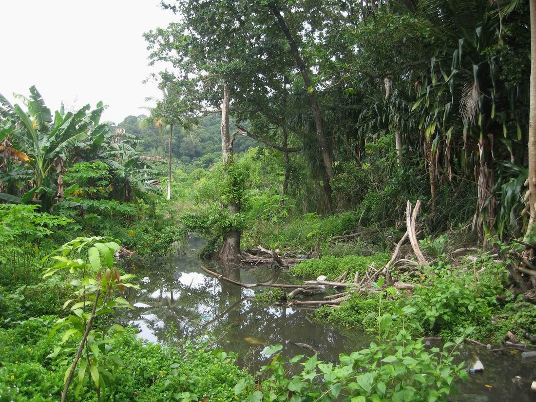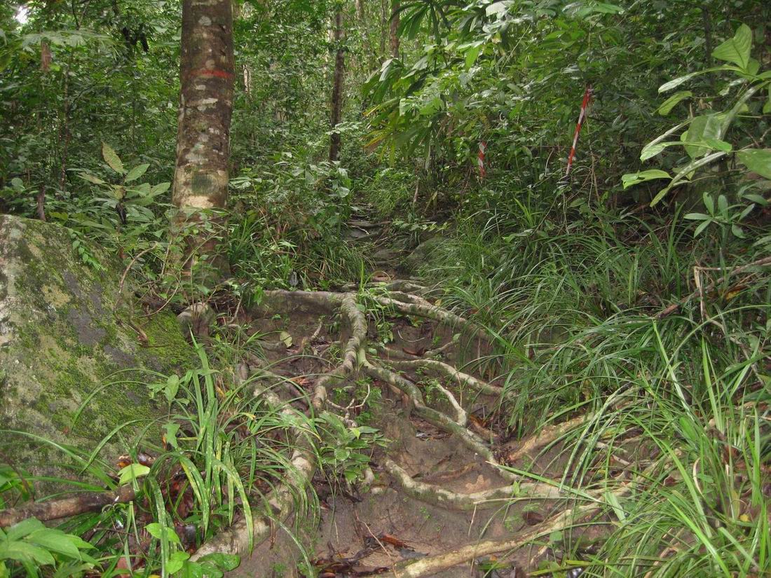 第六天, 往南再次走过昨天经过的两座栈道,根据地图判断上山的路应该就在附近了,这里有一处废弃的公共浴室和厕所,但就是没有找到上山的路,好不容易看到一个当地人,连忙上前询问,原来小路就在公共厕所右手边的草丛中,没有任何指示牌,没人指点的话是很难找得到的。此时为9时50分,由此开始上山,说是山实际上并不是很高,但路比较的难走,盘根错节的树根长期经人踩踏后裸露在外,形成纯天然不规则的上山台阶,四周枝藤密布,有的地方只能弯腰曲行,偶有巨大山石拦路,体型丰满者只能侧身蛇行,但沿路树枝上适时挂着红白相间的塑料彩条作为路标,一点儿也不用担心迷路,如果在这里迷路可是找不到任何人的。爬了半个小时,10时10分到达了坡顶,这里有四条平行的水泥石基,估计原来也有什么建筑。接着下坡走了15分钟,10时25分出了山路进入到南部海滩的Everfresh Chalet,穿出来就是海滩的最西端。 南部海滩是大停泊最长的海滩,但整个海滩冷冷清清,偌大的海滩里鲜见游客,做出海生意的中介也只有零星的几家,海水混浊海浪也很大,所以也没有人游泳潜水,甚至也没有人在海滩上晒太阳。我沿着沙滩一路往东,依次经过Flora Bay Resort Ⅰ、Fauna Beach Chalet、Flora Bay Resort Ⅱ、Samudra Beach Chalet和Arwana Perhentian Resort,这几家度假村外观都不错,尤其是Flora Bay Resort连片的小木屋规模很大,东面最尽头的Arwana Perhentian Resort外表很大气,这家度假村是我预定时的备选,后考虑到位置比较偏僻而舍弃,现在看来这样的舍弃还是对的,这里挺适合度蜜月,但不适合举家甚至数个举家出游。 看过南面的海后,陈峰夫妇决定乘Water Taxi回Tunabay度假村,康华和我两对夫妇按照计划继续下一个目的地P.I.R.(Perhentian Island Resort)海滩,从地图上看南部海滩通往P.I.R.海滩的路在Fauna Beach Chalet和Flora Bay Resort Ⅱ之间,但问了当地人后得知这条路的南半段已经废弃了,现在的通道口在Samudra Beach Chalet和Arwana Perhentian Resort两个度假村之间。 11时30分找到路口开始往西北进发,这是一条机耕土路,两条拖拉机的轮胎印深深浅浅的向前延伸着,路的前一程两边是灌木杂草,两条巨蜥看见人影嗖的钻入草丛。后程渐渐的进入了热带雨林的树丛,一路有缓缓向上的坡度,但比前一条路好走多了,沿途也有路标,但不是扎在树上的彩带而是红漆在树上画的箭头,整条路上坡长而缓,下坡相对来说短而陡,所以下山没多久就听到了海浪的声音。 11时55分从后院进入到P.I.R.,这家度假村全是品质很不错的小木屋,号称停泊岛最好的度假村应该是名副其实的,穿过小木屋来到P.I.R.海滩,沙滩上的游客比南部海滩要多,躺在沙滩上晒太阳的全是西方游客。今天这里的海浪也很大,海水也不是很清,下海游了一会儿后就铺条毛巾躺在沙滩上睡觉了。