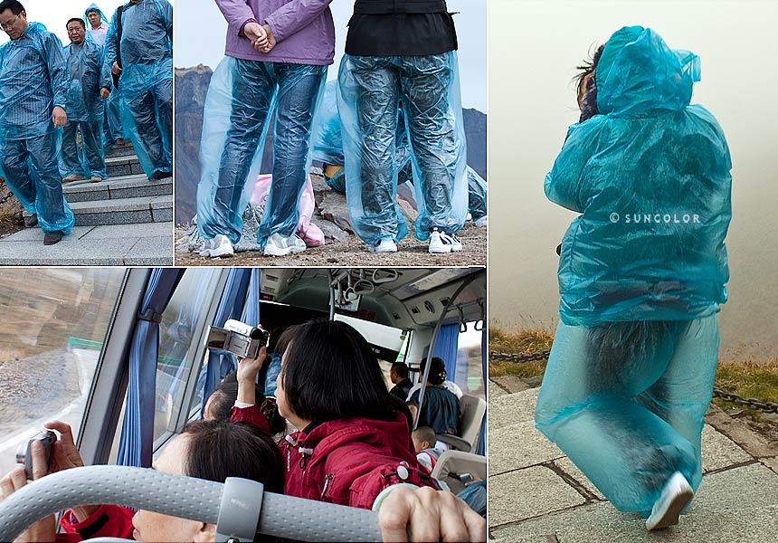 终于来到了山脚下,因为雨天又或者早已过了天池的旺季,来旅游的人并不是很多,我们把我们所有的厚衣服都穿上了,包里又装上了师傅给的两件厚外套、雨裤,犹如出征的战士一般全副武装,师傅只是不停叮咛,山上瞬息万变,既然这么远来了,千万不能草草下山,想着师傅要在如此的凄风冷雨中等上一天,心中只有感激。 售票大厅装修得非常雅致,还有那个豪华的卫生间,也让人心情轻松又愉快,只是这一切只限于售票大厅,景区内的卫生间令人作呕,所以至今怀念九寨沟,虽然门票不菲,不过依然觉得物超所值,或许有人认为这些小小细节,跟景区的景色相比应该不值一提,可是细微之处更应体现出人文关怀,才能让整个行程留下一个真正美好的记忆。 我们上了景区内的环保车,除了司机还有一个工作人员,车子行进中工作人员对于景区内的景色没有一句介绍,只是反复强调山上已经大雪纷纷,气候更是其冷无比,所以大家一定要租借他们的大衣,反反复复不停教诲,其实景区赚钱应该可以理解,可是如此的言过其实,赤裸裸地只紧紧盯着游客的钱包,实在令人感到无比厌烦。 随着山势慢慢盘旋而上,山中的雾气却是越聚越多,盘旋在山头始终不散,被雨水洗涤过的那份清新在林中飘扬,周边的景色越来越美,每个人都紧张地拿着相机采集美景,整个车厢顿时看到不断跑动的人群,兴奋和激动并没有被窗外的雾气打散,反倒是云雾缭绕的美景让大家多了一份期待,终于汽车停下了,以下的路程是需要拾级而上的,这时工作人员终于说了一句和景色有关的话,那就是赶紧上山或许有希望看到天池。 望着直插云霄的天际路,若隐若现地隐没在袅袅的云雾中,台阶的那段犹如架在空中一般神奇,老公说其实真无所谓看不看天池,现在这般的美景已经令人陶醉。长长的台阶让人气喘吁吁,望不到头的笔直向上更是挑战体力,慢慢得只觉的云雾不再紧紧相随,只是停留在半山腰中变成厚厚的云海,翻滚着包围着与人群嬉戏,那些穿着雨衣的人像极了神六的宇航员,天空在身边变得晴朗,天池对于我们再也不是遥不可及了。