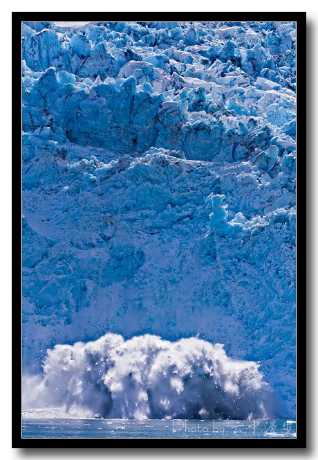 我们的船停在冰川不远处,突然冰川开始崩落(Calving)。巨大的冰块落入海中,发出雷鸣般响声,掀起惊涛巨浪。我们的船在波浪