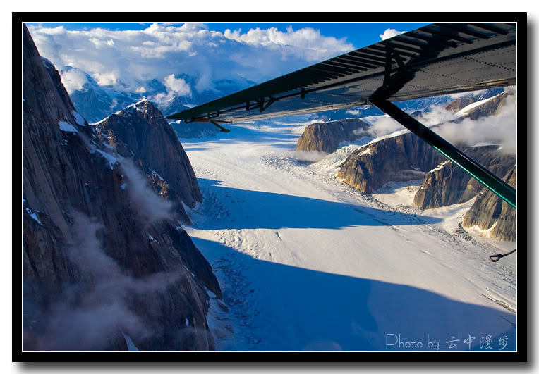 和上次在凯契根一样,我们的飞机又是一架6座绿色deHavilland Beaver。不同之处是水上飞机的浮筒换成了起落架上的轮 Denali山峰这里有着深达两英里的世界上最深的峡谷Great Gorge,其间的冰川厚度达一千多米。险峻陡峭的岩石拔地而起,直插云霄。