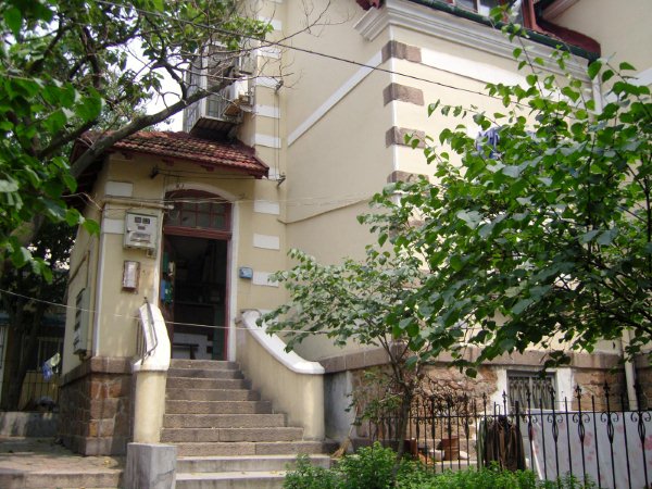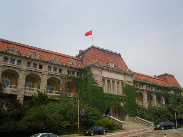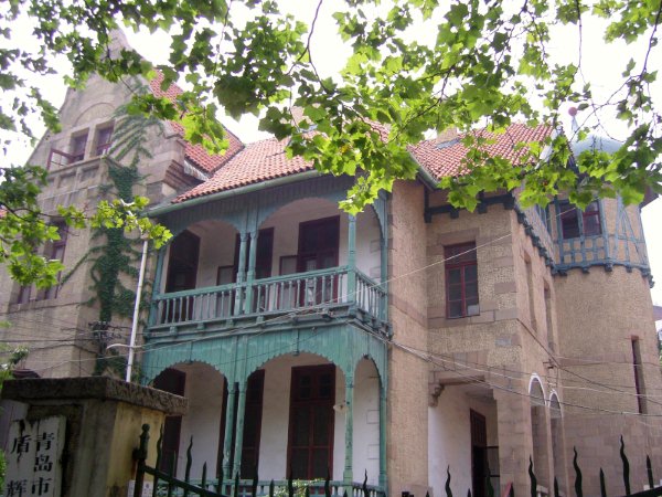 我穿梭在两旁充满异域风情的欧式建筑的街道上, 在那些一栋挨着一栋别致的老房子中寻找着总督府。不过这实在不是什么难事,看到高高台阶上覆盖着红瓦的宽大庄重的建筑,我就确定它一定就是曾经的市政府所在地总督府,让我惊叹的是,一百年前的青岛就已经有气势如此宏大的建筑了。我最先走到的是总督府的后门,看门的警卫和气却不客气,笑着拒绝我想要进去参观的要求,不过他告诉我后院的建筑都是九十年代后建的,真正的总督府只有最前面的那栋建筑。