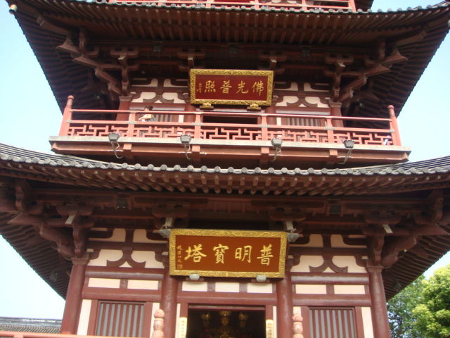 寒山寺的门票(价格:20)设计比较特别,其中一段可裁下做明信片,邮资已付,我们填写了地址寄给了自己。寒山寺不愧是寒山寺,古往今来不知有多少人为了一感那首古诗之意境慕名而来,寺内香火鼎盛,我们买了香烛,四面八方拜了几拜!寒山寺不小,一路游览,最后看见的是“普明宝塔”,塔高五层左右,由于上下都只有一座楼梯,看着拥挤的人群,我们四个一致同意不登塔了,就在院内抬头仰望吧,院落两侧皆有长廊,墙上都是石碑,多为诗词歌赋。据说每年的除夕都有听钟声的活动,佛经曰:“闻钟声,烦恼轻,智慧长,菩提增。”寒山寺是个不错的景点,所谓“宝塔高耸,佳木参天,殿宇焕彩,佛像庄严”。
