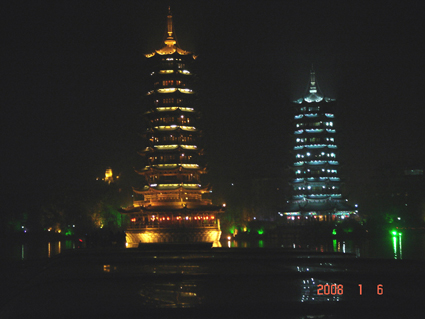 167点半准时起飞,11点顺利到达桂林。桂林的天气没有下雨,天灰灰的,感觉不是很透。坐上机场大巴,顺利到达如家。因为定的房型没有了,免费升级到商务大床房。放下行李去吃饭,在门口遇到三轮车夫,热情的要带我们去吃饭,说可以去看看,吃不吃没关系。我和老婆都是那种人家一热情就没主意的那种人,所以结果大家就可想而知了。师傅把我们带到了离象鼻山很近的一个美食街,推荐了一家饭馆,没想什么就进去了。结车费的时候因为没有2元钱,师傅说吃完饭再接我们最后再说。当时我们觉得这师傅还真不错!进门点了大家推荐的荔蒲扣肉,炸江虾,还有米粉。价钱还真不便宜,一共花了一百多,后来才怀疑三轮车夫为什么那么热情。饭的味道吗,扣肉没有想象的好吃,江虾因为没告诉师傅少放辣椒,所以是巨辣。米粉的味道还是不错。吃过饭,决定去象鼻山,因为知道现在水很少,门票的价钱又觉得不值,就没有买票进去。决定坐竹筏看山。在三轮车师傅的推荐下坐上了竹筏,280元据说是淡季的价钱。在船上坐了有最多30分钟,就结束了。在江对面看的山,不过现在在施工,标语写的是在排险。反正景色不怎么样!这样就决定回饭店,等人家把两江四湖的票送来。(票是在北京通过网上在旅行社订的,130/人,便宜不少)。顺利拿到票,结果上船的地方还是在象鼻山那的一个什么桥,具体名字忘了。如家离那里还不算远,所以决定走着去,顺便看看桂林的街景,大概20分钟就可以到,时间尚早,又进了一家米粉店。吃了碗米粉。味道没的说。香极了……。晚7点半开船,二江四湖的夜景还是非常美的…………然后经过1个多小时的船程到了下船的地方,具体名字还是忘了,反正是一个公园里面,下船时每人发了一张光盘介绍两江四湖的,当然没有看回来。不知道东南西北,不知道酒店在哪,就只有问人了。坐上公车,居然是双层半敞棚,有意思。沿途经过了桂林的商业街,看着还挺热闹。老婆要下去逛,被我否了。一来我不愿意逛街,二来早上起的早,明天还要去阳朔要早点休息。再说,觉得北京到处是这样的街区,没什么意思。顺利到达如家,睡觉。