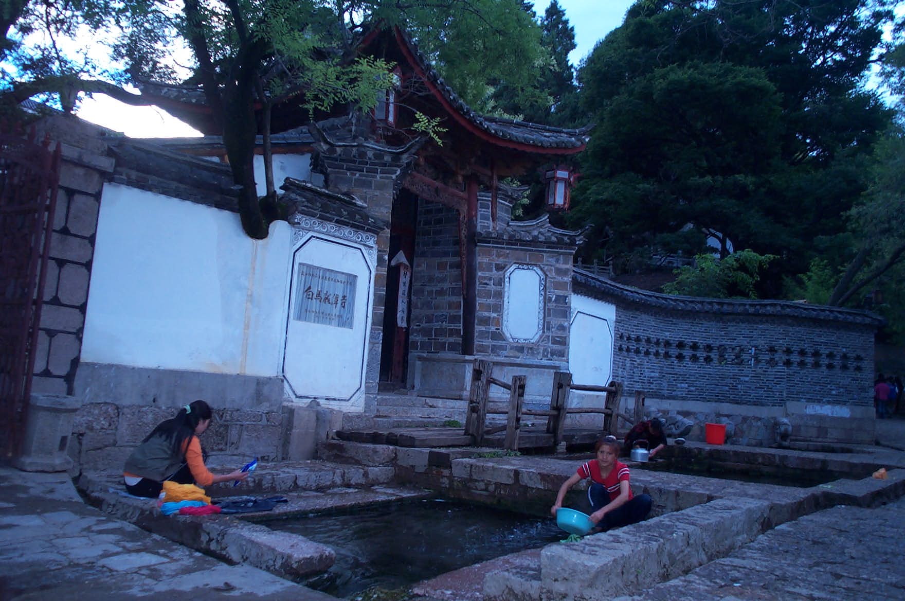 回来的路上我们竟然发现住宿边有几个四四方方池子,刚才还是浑浊的洗菜水,洗衣水,过了一会儿全变成清清亮亮的了,这自然是那套净水的功劳了。旁边有一个寺庙,白马什么寺,门是虚掩着的,里面一个人都没有,假山,池塘,自由自在的各色的鲤鱼。我们最喜欢这没人打扰的地方。
