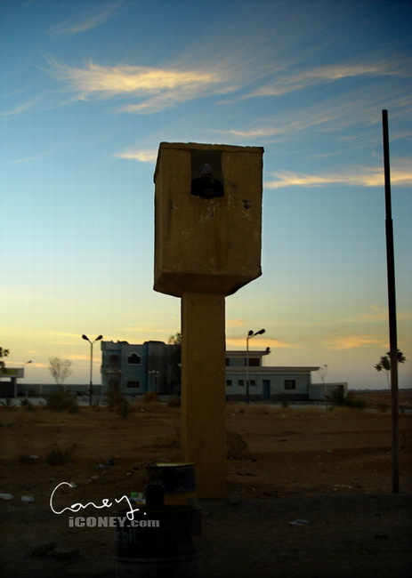 天蒙蒙亮了...车上我摆弄着相机...埃及旅游线路上有很多哨亭...黑乎乎的窗口里伸出的枪管除了能给游客带来不安以外,对恐怖分子反倒没啥震慑作用吧....