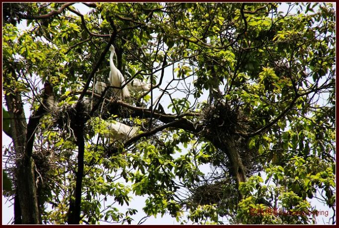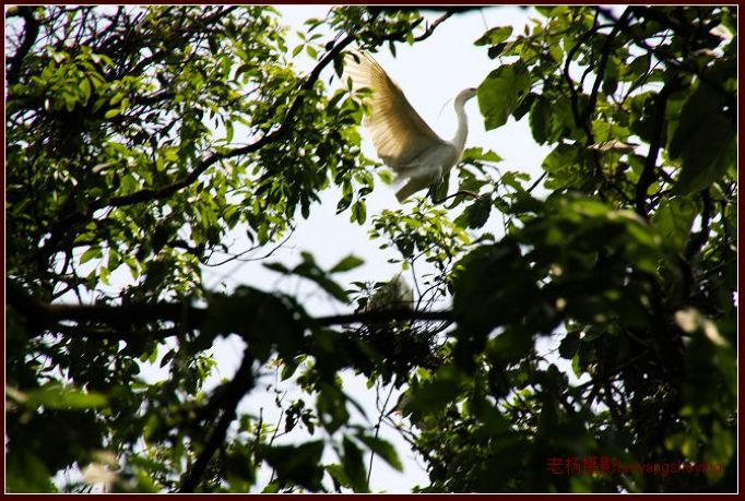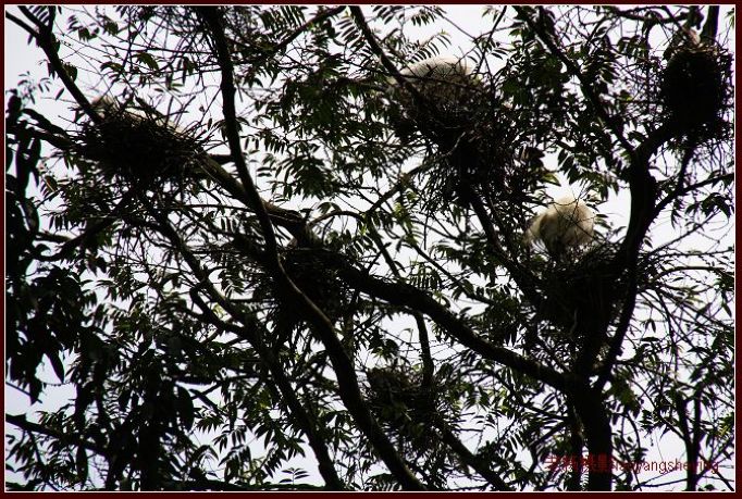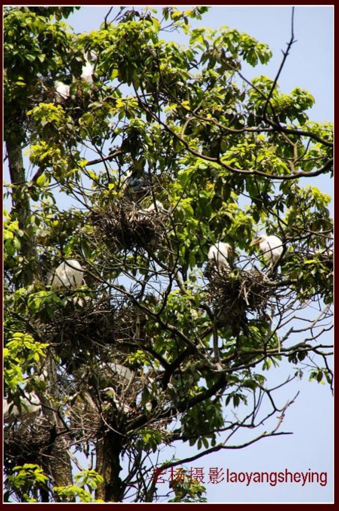 镜头一半:绿树茂叶白鹭闹林 古民居所在的夕佳山,山形鸟瞰犹如一只大螃蟹,民居就建在蟹背之上。大门前一口水塘,如蟹口,门内两口水井,如蟹眼。站在庄前极目远眺,山下数十座小山丘犹如一只只小螃蟹匍匐在前。远处,左边青峰山逶迤连绵,右边白虎岭山形耸峙,甚为壮观。传说,夕佳山民居创建人黄应江在始建庄园时,请来的风水先生看了地形后说,青龙、白虎、朱雀三个方位均气势宏大,唯宅后玄武太矮,建议在宅基后垒土造山,以壮玄武,或广植树木,可招吉祥。黄应江听后采纳了这一种建议,在宅后广植桢楠。楠木成林之后,引来群群白鹭安营筑巢,繁衍后代。每逢阳春三月,鹭鸟回归,鸹噪不止,热闹非凡。傍晚,夕阳西照,白鹭回巢,千鸟归林,“夕佳山”因而得名。因此,十六年前我来时,叫白鹭山庄。今天还没有进山庄,老远就听见了白鹭的欢叫声。隔着院墙,看见了庄园内的桢楠林里,成千上万只白鹭、苍鹭云集林中,宛若片片白云,镶嵌浮动于林梢树丛,它们在林中营巢栖息,啁啾终日,景色十分壮观美丽。白鹭又称鹭鸶是一种非常美丽的水鸟,“两个黄鹂鸣翠柳,一行白鹭上青天。”古人对它的赞美早让其中国人心中诗情画意的一部分。白鹭天生丽质,身体修长,它们有很细长的腿及脖子,嘴也很长,脚趾也是如此,他们全身披着洁白如雪的羽毛,犹如一位高贵的白雪公主。这就是镜头的一半,热情与喧闹,幸福与快乐。
