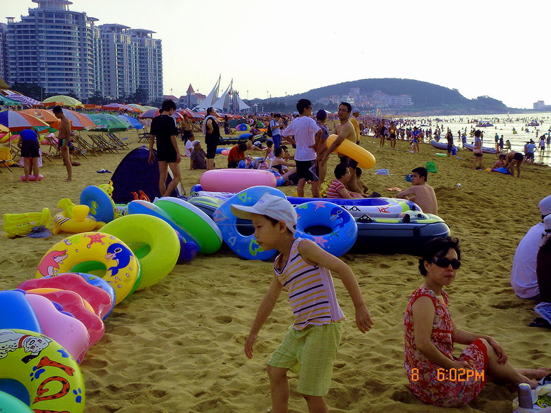 3.威海重点推荐:国际海水浴场和金沙滩海水浴场。在威海市中心偏北,在市中心联华附近有好多车可以到,小巴7路大约10分钟一次,直接拉到浴场。路经哈工大威海校区,到了国际海水浴场,右侧就是红色的山东大学在不远处的海岸线上,真是感叹山大学生的幸福啊。P很喜欢这片浴场,虽然人很多,但正对西面,可以观落日。沙子亦很细软,席沙而坐,又开始发呆,等待日落。等待的同时,用沙子把同行的KK给活埋了,露出个脑袋,给我们拍照用,一个个人留下自己的大坐,有趣。不久,日落缓缓而渐渐,天色逐渐泛起橘红光韵,感叹人生美好,岁月峥嵘。