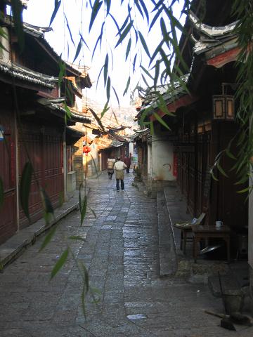 我钟爱那久负盛名的四方街。窄窄的四方街,是古城最著名的所在。这里是集市的场所,店铺林立,溪流潺潺。这里摆摊售货的多是纳西妇女,商品除了旅游纪念品外,更多的是些日常用品。流连在四方街,你会欣慰地感到纳西人的生活并没有因着世界文化遗产的盛名而累,生活在这里以它贯有的方式继续着。倘徉在四方街头,看来来往往的游人脸上带着闲适的神情,有的奇装异服,有的衣冠不整,裹着新买的羊绒披肩,头上包扎头巾,活象在逃难,可是却并不可笑,抛开钢筋水泥城市的束缚,放任自己的心肆虐飞扬,这理应是游客的特权。