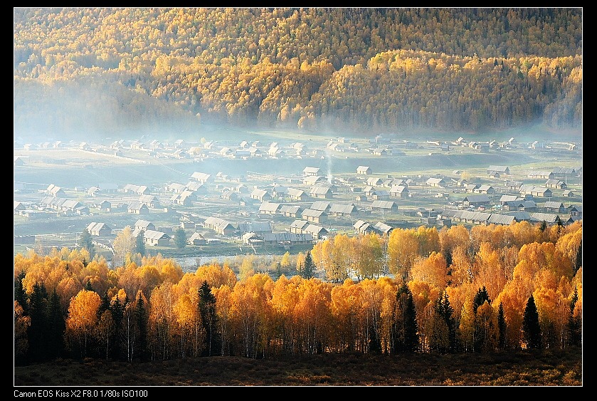 小镇黄昏:太阳渐西,晃晃悠悠地从土路下山。站在山坡的平台上向下看,错落在林间的村子被夕阳摩挲得线条柔和,而点缀在小镇里的桦树则被阳光映射得艳黄发亮,叶子变成了透明的金色,炊烟从一间间房子里袅袅钻出,像一只只对着晚霞挥舞告别的手臂。夜幕就这样悄然而来。。