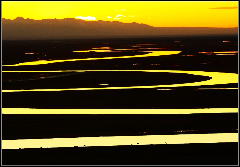 九曲十八弯:到达巴音布鲁克已是傍晚,为了能看上九曲十八弯的落日,匆忙包了辆越野车进景区。开都河在这里的形神不亚于黄河的九曲十八弯。夕阳余晖下,能看到河岸边牛马吃草的剪影,为这幅金亮的画卷平添了一抹生动的气息。
