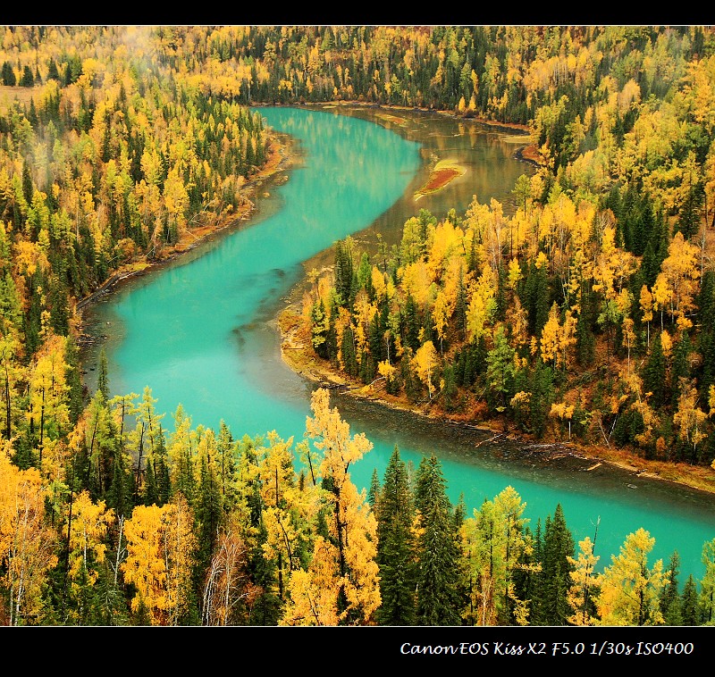 村旁桦林:这个半天在禾木闲逛。禾木村的两旁都是白桦林。向纵深走去,叶子愈发的黄。找到一棵黄得耀眼的树,架起三脚架,把这里作为人像拍摄的场景。旁边只有一只自由吃草的牛,见证了我们跑来跑去换动作的游戏。 天做幕 地为席:踱到山坡上的草地,躺下身看着蓝得没有任何杂质的天空,还有缀在上面淡淡的云丝。周围很安静,远处的雪山宁谧地站在那里,一切都变得空灵,时间仿佛被遗忘,就这样一直静止下去。 禾木,再见:在禾木包了辆车回贾登峪,公路两边是徒步时看不到的另一番风景,更辽阔,更壮美。再次借用选美中国对禾木图瓦村的评价与它告别:“所谓伊人,在水一方。” 9月23日 贾登峪->喀纳斯 卧龙湾雨中行:天气不作美,下雨了。坐区间车来到卧龙湾,导游mm说它像某种恐龙,取名卧龙湾,而我们却说它更像只手枪。或许是禾木养成的习惯,我们打算从这里徒步到月亮湾,一公里不算什么,就是下雨麻烦些,庆幸的是阴天里水的颜色并没受到什么影响,反而另有一种迷蒙潋滟的风度。